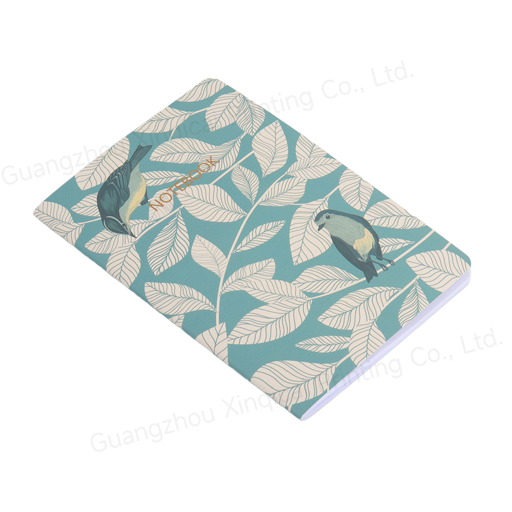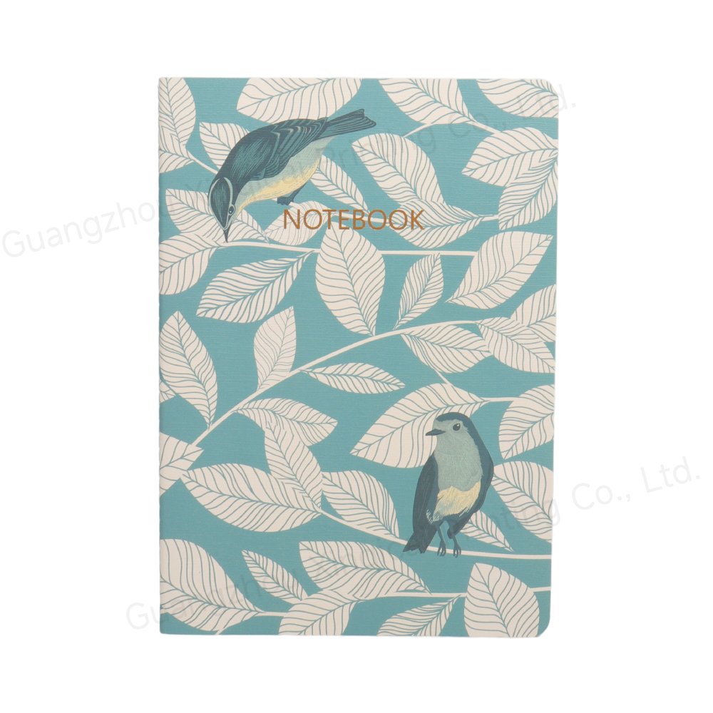 This notebook's cover features a refreshing blue-green background, accented by delicate leaf and bird motifs, seemingly capturing the vibrant energy and spirit of nature. The striking and elegant "NOTEBOOK" logo evokes a refined artistic design.